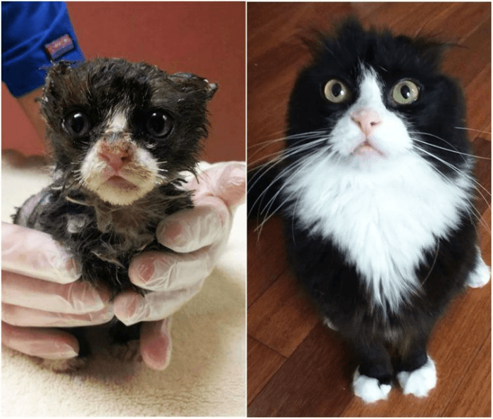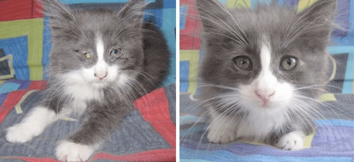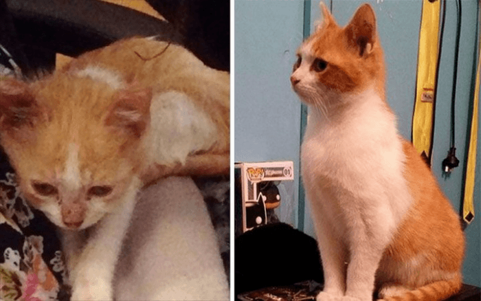 התמונה הבאה מציגה חתלתול בשם פינגווין. השינוי המופלא שלו התרחש תוך שבועיים בלבד.
