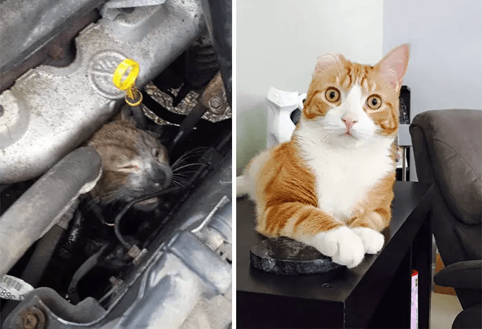 החתול הג'ינג'י הזה טיפס לתוך מכונית כדי להתחמם ליד המנוע. כשהמנוע התניע, החתול נכווה קשות מהשמש ואיבד אוזן אחת. זה לא מנע ממנו למצוא בית ובעלים אוהבים.