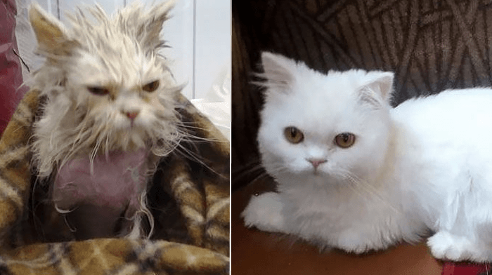 אנשים לקחו הביתה גור רחוב רטוב ומלוכלך עם פרווה סבוכת וכפות רגליים כואבות. לאחר טיפול נרחב, הגור הפך לגור לבן כשלג ומרוצה.