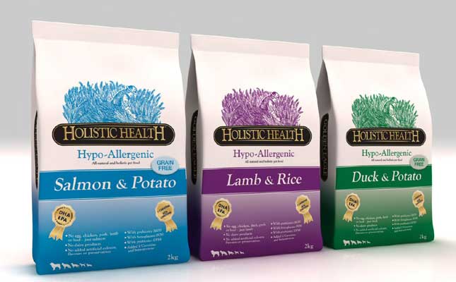 "Go Natural Holistic". מזון זה הוא די רב-תכליתי: פס ירוק מציין רכיבים ללא דגנים, פס ורוד מציין עוף, פירות וירקות, ופס סגול מציין רכיבים המכילים בשר בלבד. הוא מסייע במניעת השמנת יתר ובעיות במערכת העיכול.