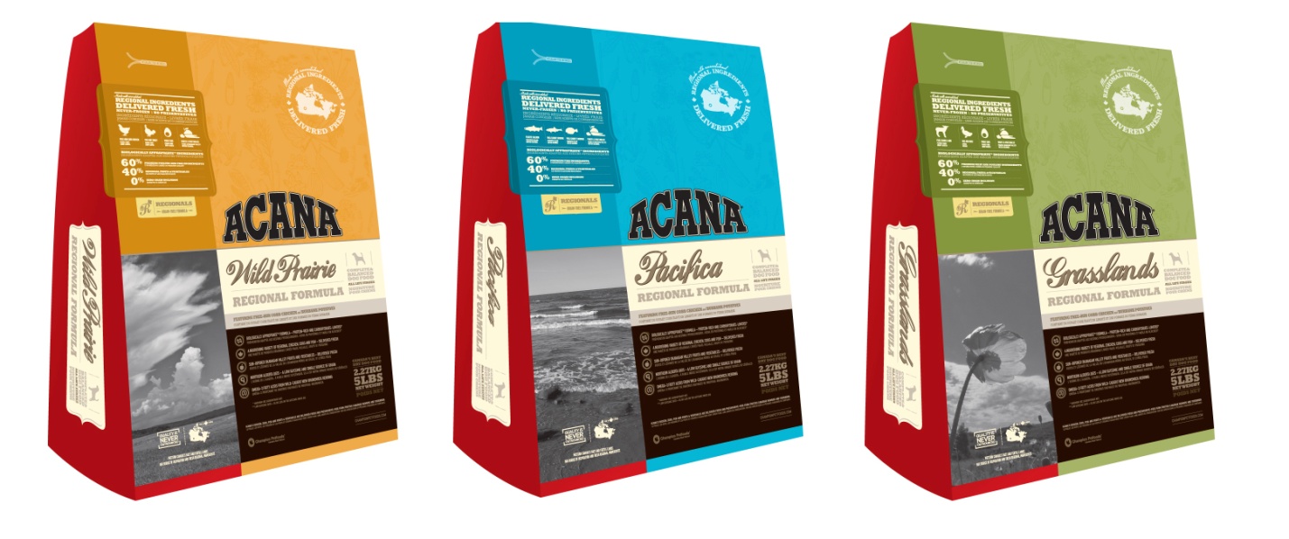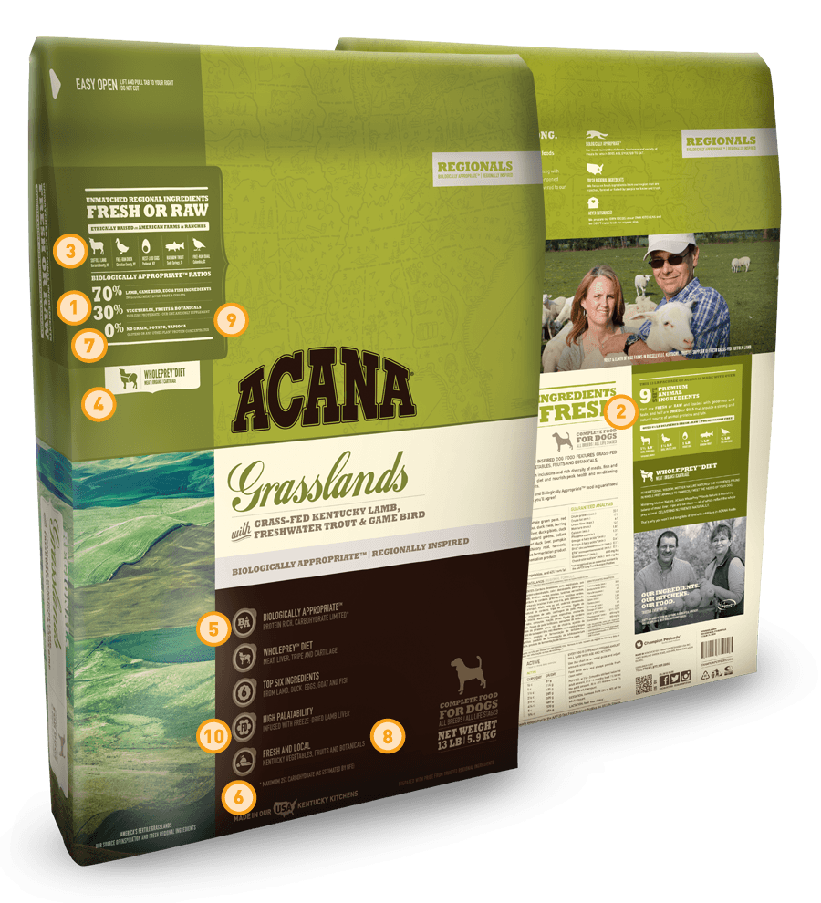 Acana Grassland. המזין ביותר מבין המתחרים. הוא מכיל כבש, ברווז, דג חתוך, הרינג ופולוק, כמו גם ביצי עוף וכבד כבש וברווז. הוא כולל גם קטניות כמו עדשים ואפונה. היצרנים כללו גם פירות וירקות כמו דלעת, גזר ותפוחים, כמו גם אצות ועשבי תיבול המסייעים בעיכול.