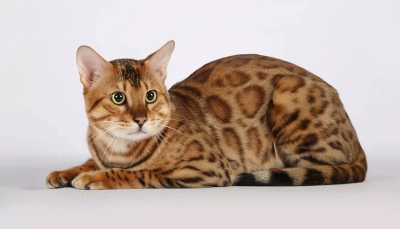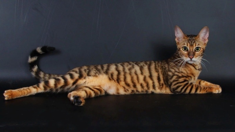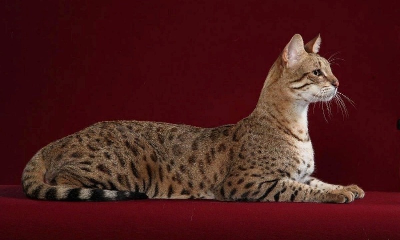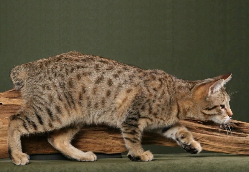 לחתול סוואנה צוואר מוארך ורגליים דקות. צבעו יכול לנוע בין שוקולד לזהב וכסף.