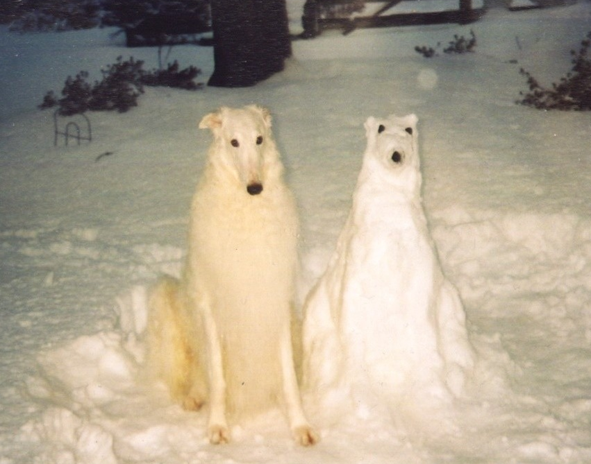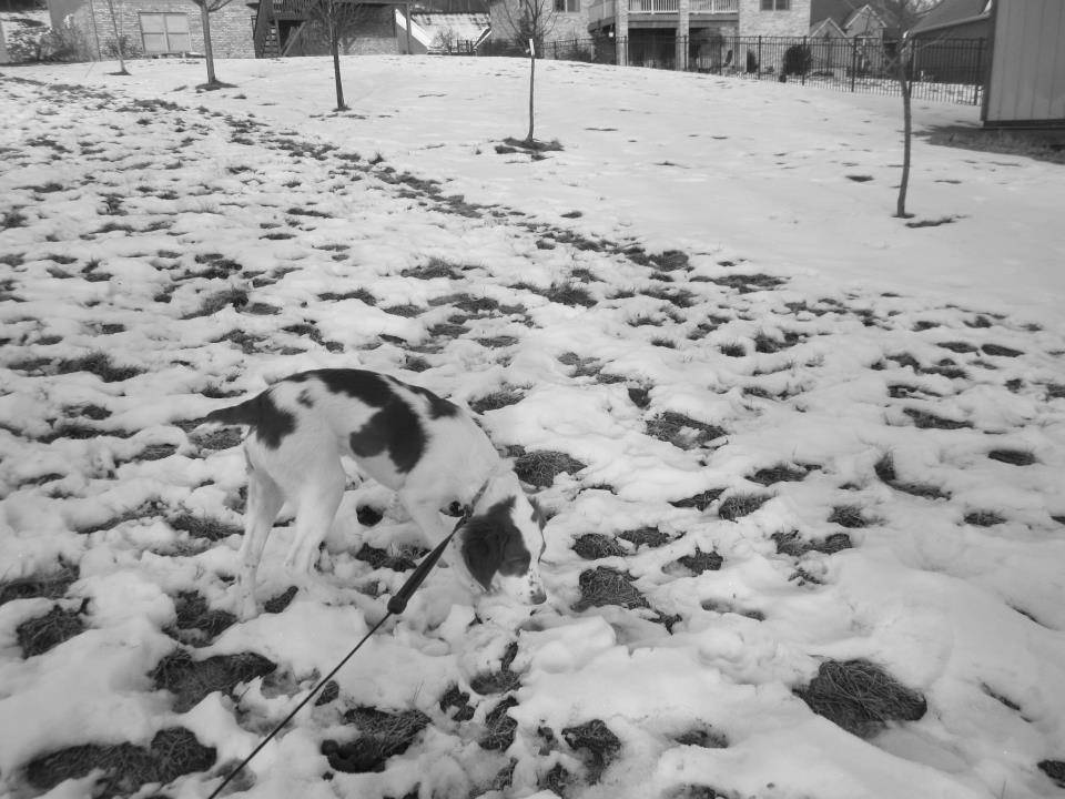 הכלב מתחזה בחריצות לאיש שלג. נראה שהוא עושה עבודה טובה.