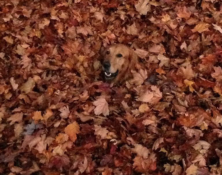 גולדן רטריבר התחבא בין עלי הסתיו האדומים.