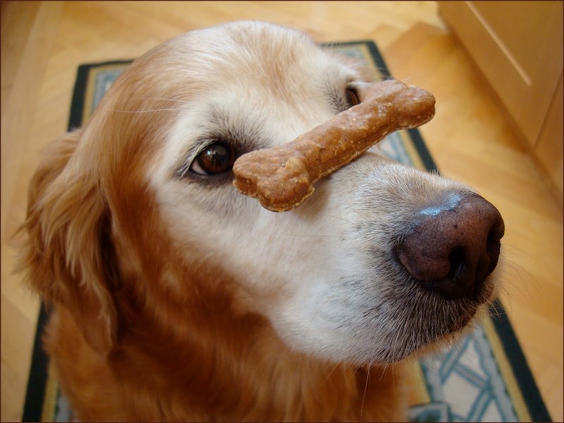 הטריק הוא שהכלב יושב בשקט עם חתיכת גבינה על האף. גבינה עובדת הכי טוב: אפשר לחתוך אותה לקוביות והיא יושבת בנוחות על האף.