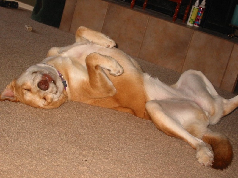 תנוחה מקסימה זו אופיינית יותר לגורים, אך ניתן לראותה גם אצל כלבים בוגרים. בה, בעל החיים נרגע לחלוטין ונופל לשינה עמוקה. במקביל, תנוחה זו אופיינית לכלבים אנרגטיים בעלי כישורי שמירה, מוכנים לקפוץ במהירות על רגליהם במקרה של סכנה בלתי צפויה. היא אופיינית גם לאלו שאוהבים להשתובב ולשחק.