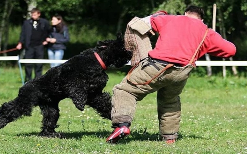 אם בעל החיים לא מצליח להפחיד את הפולש במראהו המאיים, הוא מיד יוצא לתקיפה. הכלב תוקף, תוקע את הפולש מתחתיו ומחזיק אותו למטה עם כפותיו על החזה עד להגעת בעליו. הטרייר השחור כמעט ולא משתמש בשיניו, למרות נשיכתו החזקה. הכלב ירדוף רק לפי פקודה מבעליו.