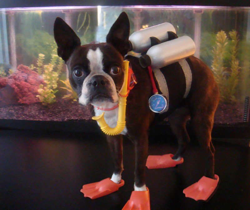 חליפת צלילה. מעניין אם הכלב מרגיש בנוח עם סנפירים?