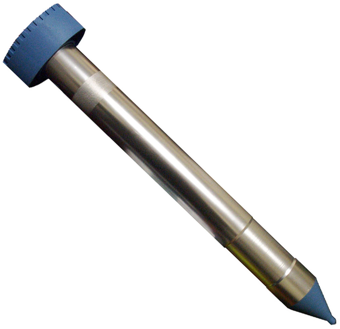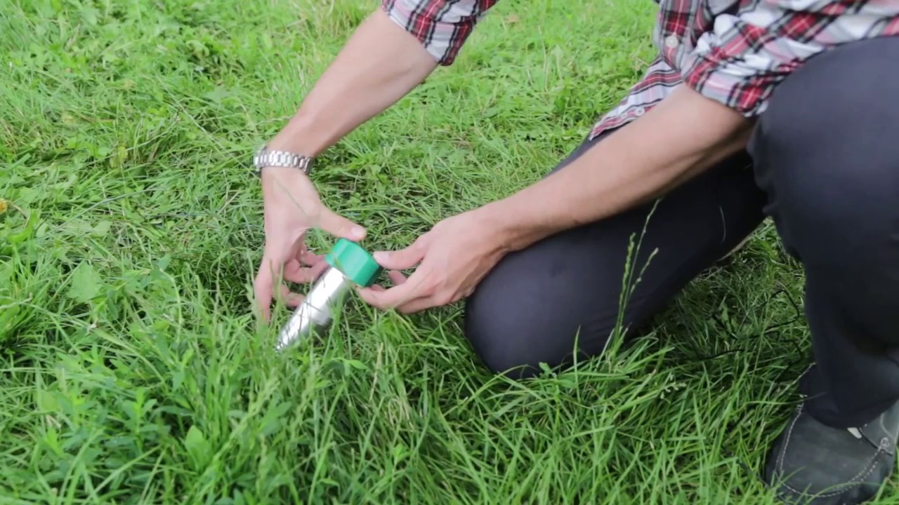 - לאחר מכן, הכניסו את ה-EcoSniper לאדמה, כשהקצה המחודד כלפי מטה. הימנעו מחפירת בורות או חורים מראש, שכן הדבר ימנע מהמכשיר להחזיק אותו בצורה בטוחה ויפגע בשידור האולטרסאונד. גזע המכשיר צריך לחדור עד שלושה רבעים מאורך האדמה.