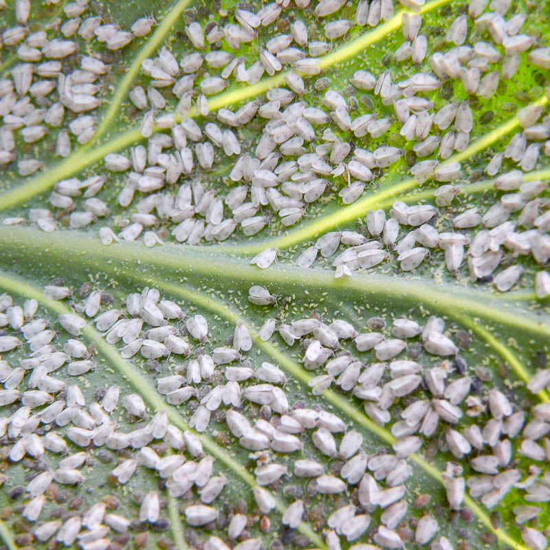 - זחלים לבנים קטנים או אשכולות של בוגרים בחלק התחתון של העלים.