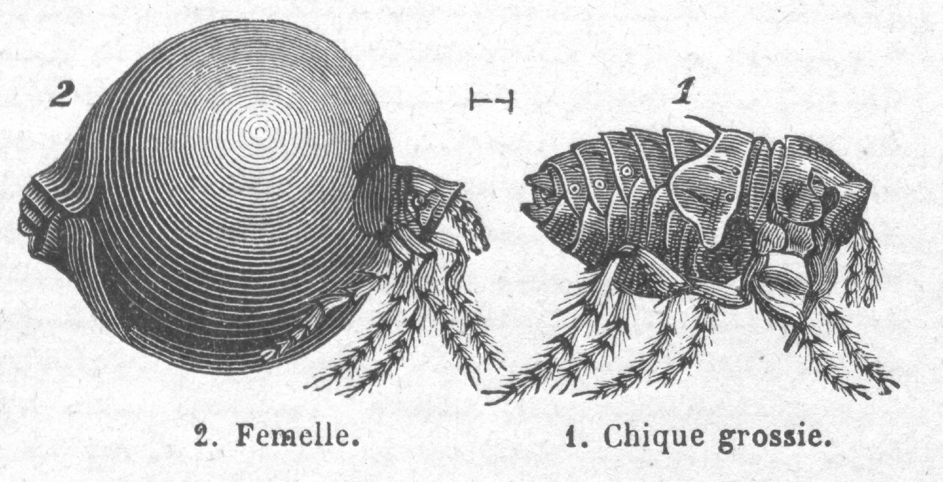 הנקבות נצמדות לעור כף הרגל ומתחילות לנשוך. לאחר הגירוי, הטפיל הופך כדורי ומתחפר עמוק יותר בגוף, שם הוא מתחיל להטיל ביצים. אם הנקבה מתה בתוך העור, מופיעים כאבים ודלקת. עקיצות הזכרים פחות כואבות, דומות לעקיצות יתושים, וחולפות תוך 2-3 ימים.