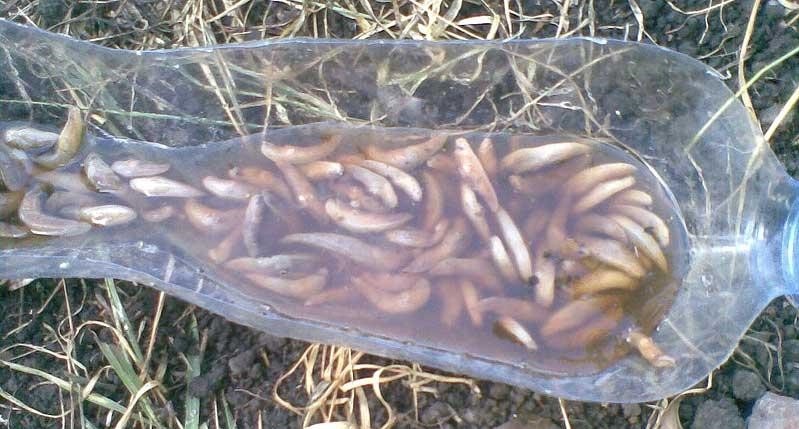 - לחצו מעט על בקבוק פלסטיק כדי למנוע ממנו להתגלגל, ושפכו פנימה מיץ מתוק או קומפוט. הרכיכות יימשכו לריח ולא יוכלו לברוח.