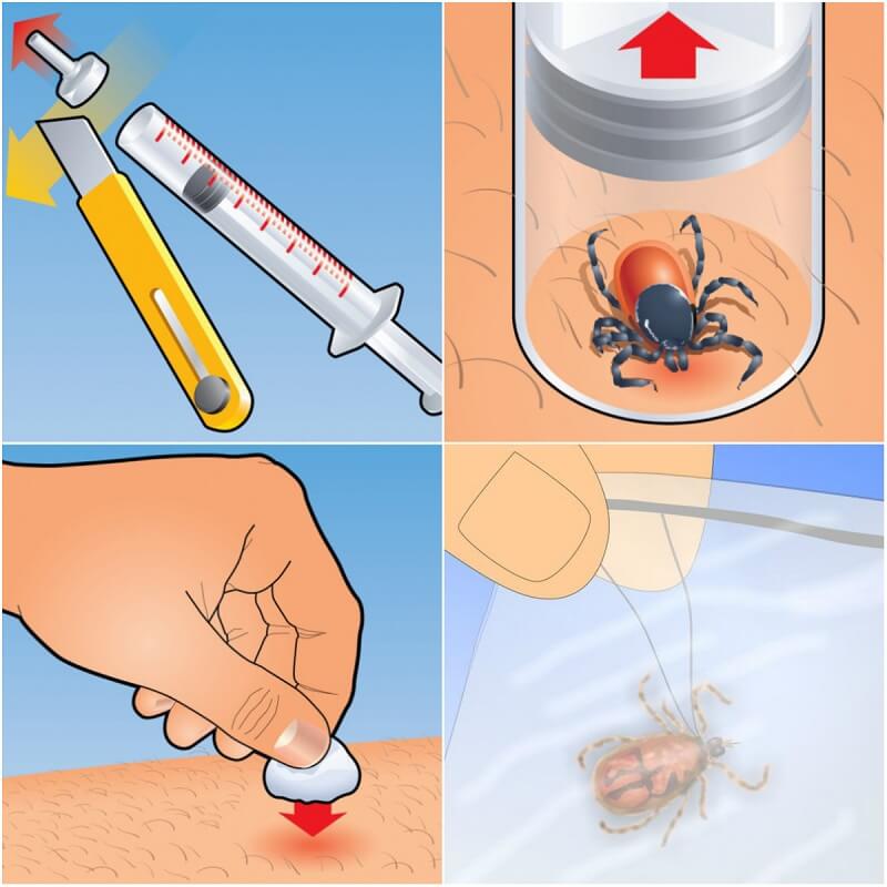 בעזרת סכין, חתכו את החלק העליון (קצה המחט) של המזרק, תוך השארת קצה חלק. לאחר מכן, לחצו בחוזקה את המזרק החתוך כנגד אזור הנשיכה ושאבו את האוויר החוצה. הפרש הלחצים ידחוף את הקרציה החוצה. כל שנותר לעשות הוא לטפל באזור הנשיכה.