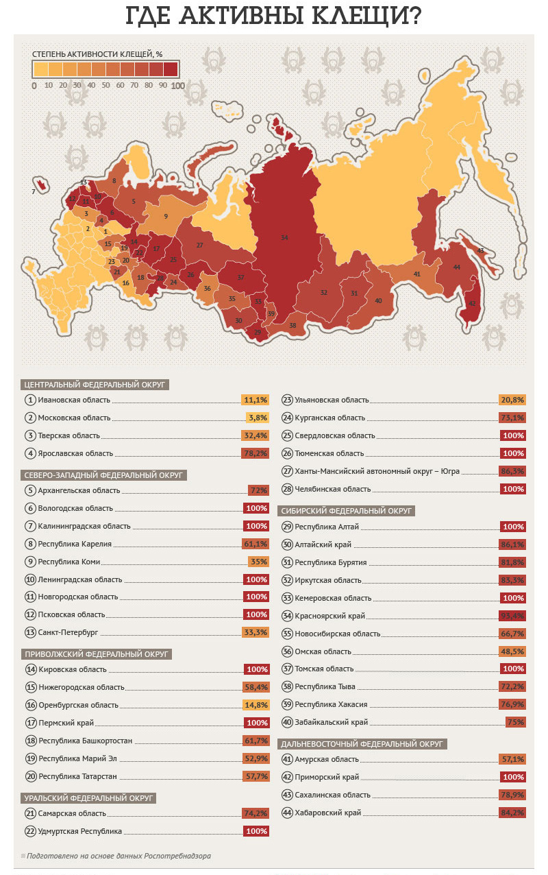 ההתקפות הנפוצות ביותר של מכרסמים מסוג איקסודידים מתרחשות בדרך כלל בצפון מערב הפדרציה הרוסית - באזורי נובגורוד, פסקוב, לנינגרד, וולוגדה וקלינינגרד. סיביר, ובמיוחד אזורי טומסק וקמרובו, כמו גם רפובליקת אלטאי, פעילים במיוחד גם הם. אזורים נוספים ראויים לציון כוללים את הרי אורל, מחוז קירוב, מחוז פרם, אודמורטיה ומחוז פרימורסקי.