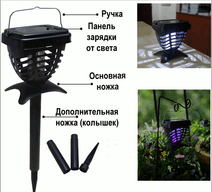 המנורה יכולה לפעול הן מרשת החשמל והן על סוללות סולאריות. ניתן להשתמש בו כפנס רגיל או כדוחה חרקים, שכן הוא מצויד בנורות LED לבנות ואולטרה סגולות המופעלות באופן ידני. העיצוב מזכיר פנסי רחוב. המכשיר מוגן באופן אמין מפני לחות. אזור הכיסוי משתנה בהתאם לדגם, אך המקסימום הוא 100 מטרים רבועים. המחירים מתחילים ב-600 רובל.