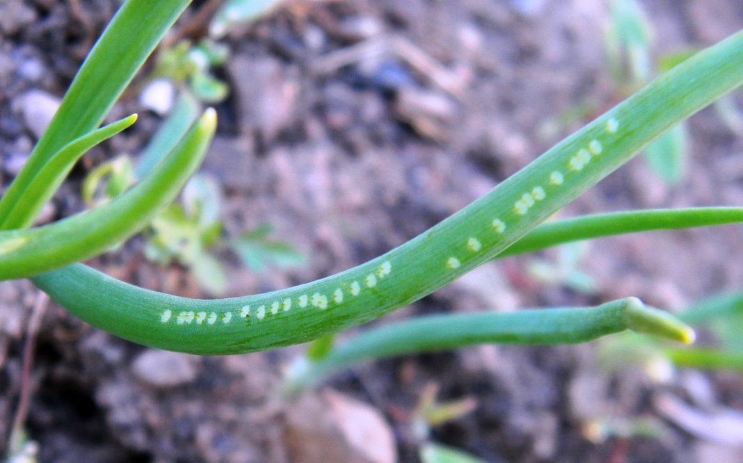 | בֵּיצָה | כ-1 מ"מ, לבן, מוארך, עם פס אורכי | על עלים, באדמה, על צוואר הבצל |