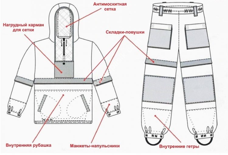 | זְאֵבוֹן זוֹלֵל | החומר, המיוצר ברוסיה, הוא קל משקל ונושם - כותנה טבעית. הוא כולל קפוצ'ון, כילה נגד יתושים, רצועות יד ובטנה להגנה מפני קרציות. מלכודות על השרוולים, המכנסיים, הגב והחזה ספוגות בחומר קוטל עש. קיימות גם גרסאות לילדים, כמו גם אוברולים. | המחיר נע בין 3000 ל-6000 רובל. |