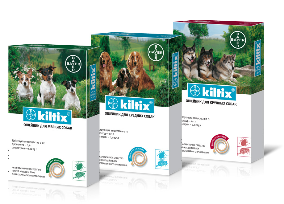 - קילטיקס. הוא מתחיל לפעול תוך 24 שעות ומספק הגנה עד שבעה חודשים. הוא משמש לכלבים בוגרים בריאים.