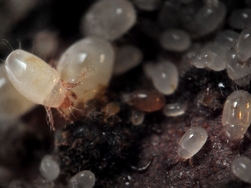 באדמה פתוחה, הוא חי אך ורק באזורים הטרופיים החמים. באקלים קריר יותר, הוא נמצא בתוך הבית (חממות, בתי אבות או חדרים). הוא חייב את שמו לעובדה שכמו החיפושית השטוחה, הוא אינו מסוגל להפריש או לייצר קורים. טפילים אלה נבדלים באורכם של 0.3 מ"מ ובמשקלם הקל, המאפשר להם להתפשט אפילו דרך מערכות אוורור.
