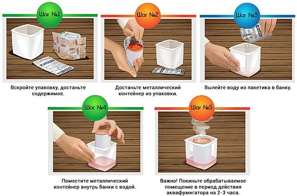 כאשר הוא מקיים אינטראקציה עם מים, החומר הפעיל של האקוופומיגטור יתחיל להפוך לאדים, וחודר לכל פינות החדר.