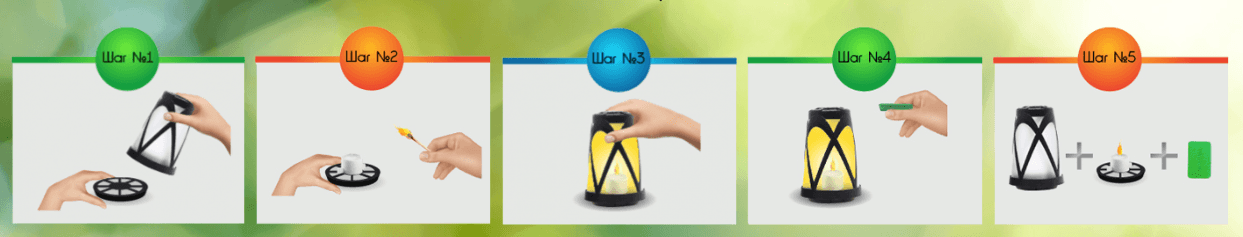 יש להשתמש רק בצלחות ובנרות המיוחדים המצורפים לפנס, שכן הם נוצרו במיוחד עבור מכשיר זה. הנר מצויד במסנן ששומר על הטמפרטורה הרצויה, והשעווה מיועדת להחזיק מעמד למשך זמן מסוים - עד שהצלחת נגמרת.