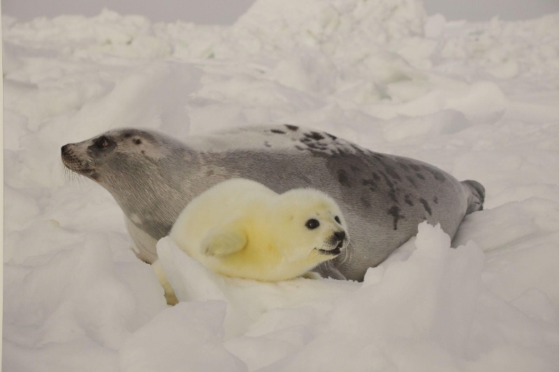 בעל חיים זה אינו דואג לצאצאיו לאורך זמן. כלב ים בן יומו נקרא גור ים. הצרור הלבן והרך נשאר לבדו בשלג שבועיים בלבד לאחר הלידה. במשך ארבעה עשר הימים הראשונים, האם מאכילה את התינוק היטב כדי שיוכל לצבור עוד שומן תת עורי, אך לאחר מכן היא נוטשת אותו, וגוז כלב הים נאלץ להסתדר בכוחות עצמו.