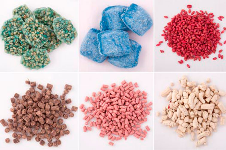 פיתיון הדגנים של Clean House עשוי מדגנים ספוגים ברעל, שרובם בצבעים בהירים - כחול, אדום.
