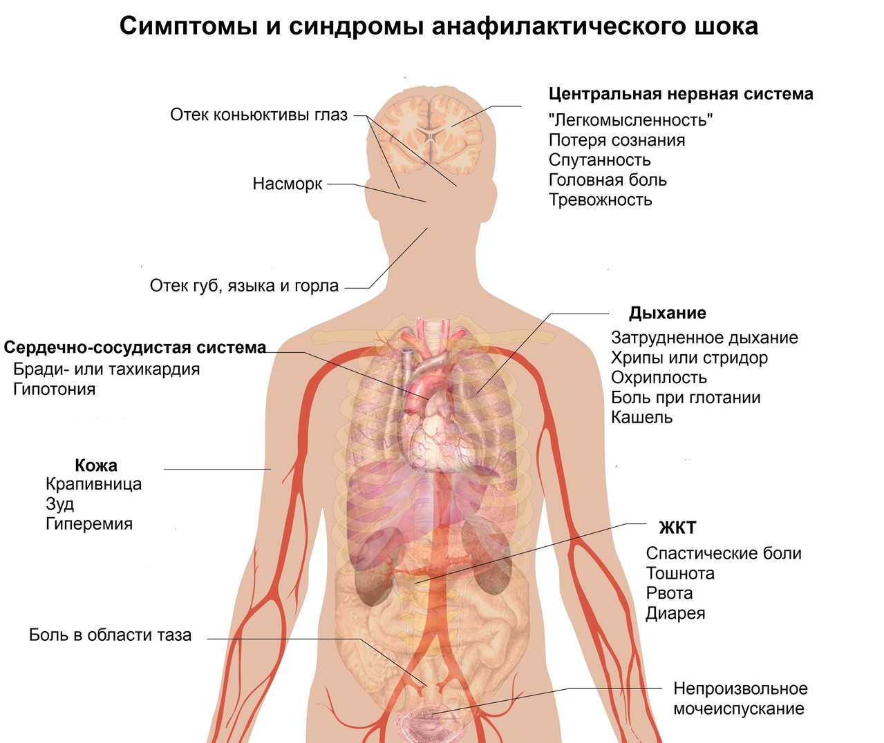 התגובה האלרגית החמורה והחמורה ביותר היא הלם אנפילקטי, שכן הוא משפיע על כל הגוף. אנפילקסיס מתקדם באופן הבא: אדם חווה חולשה, חרדה, סחרחורת, כאבי לב ובטן, אנגיואדמה, אורטיקריה, הקאות ושלשולים. לאחר מכן מתרחשת ירידה חדה בלחץ הדם, קשיי נשימה, טכיקרדיה ואובדן הכרה.