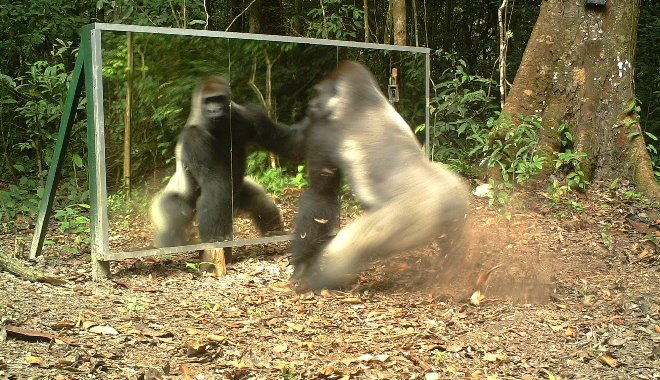 גורילה יכולה גם לזהות את עצמה במראה. עם זאת, בעל חיים זה צריך להתרגל להשתקפותו. בתחילה, הגורילה מפגינה תוקפנות.
