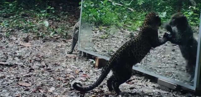 הנמר מביט בהשתקפות זמן רב, מתקרב, ואז מתרחק, מנסה להתקרב בזהירות או, להיפך, לתקוף.