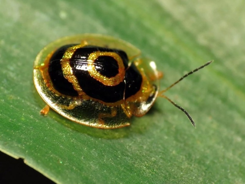 חיפושית העלים הזו נראית כאילו נוצרה על ידי צורף מומחה. צבעה מזכיר באופן בולט זהב, והיא קיבלה את שמה מצורת הקונכייה שלה. לחיפושית יש גם יכולת ייחודית לשנות צבע. הקונכייה השקופה שלה מכילה נוזל. היא יכולה לשלוט בכמות הנוזל הזה ולשנות את צבעו בהתאם לאור.