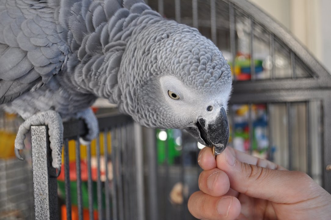תוכים אפורים אינם ציפורים בררניות, ואני לא מפנק אותם, אבל אני כן מקפיד על הנחיות האכלה קפדניות כדי למנוע מחלות. אני מאכיל אותם באגוזים וזרעים (רצוי לבנים, כי הם דלים בשומן), פירות וחתיכה קטנה של גבינה או גבינת קוטג' כדי לשמור על רמות הסידן, אבל אני אף פעם לא מאכיל אותם מהשולחן שלי.